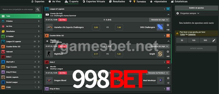 O 998Bet oferece uma grande seleção de opções de apostas em e-sports com probabilidades competitivas